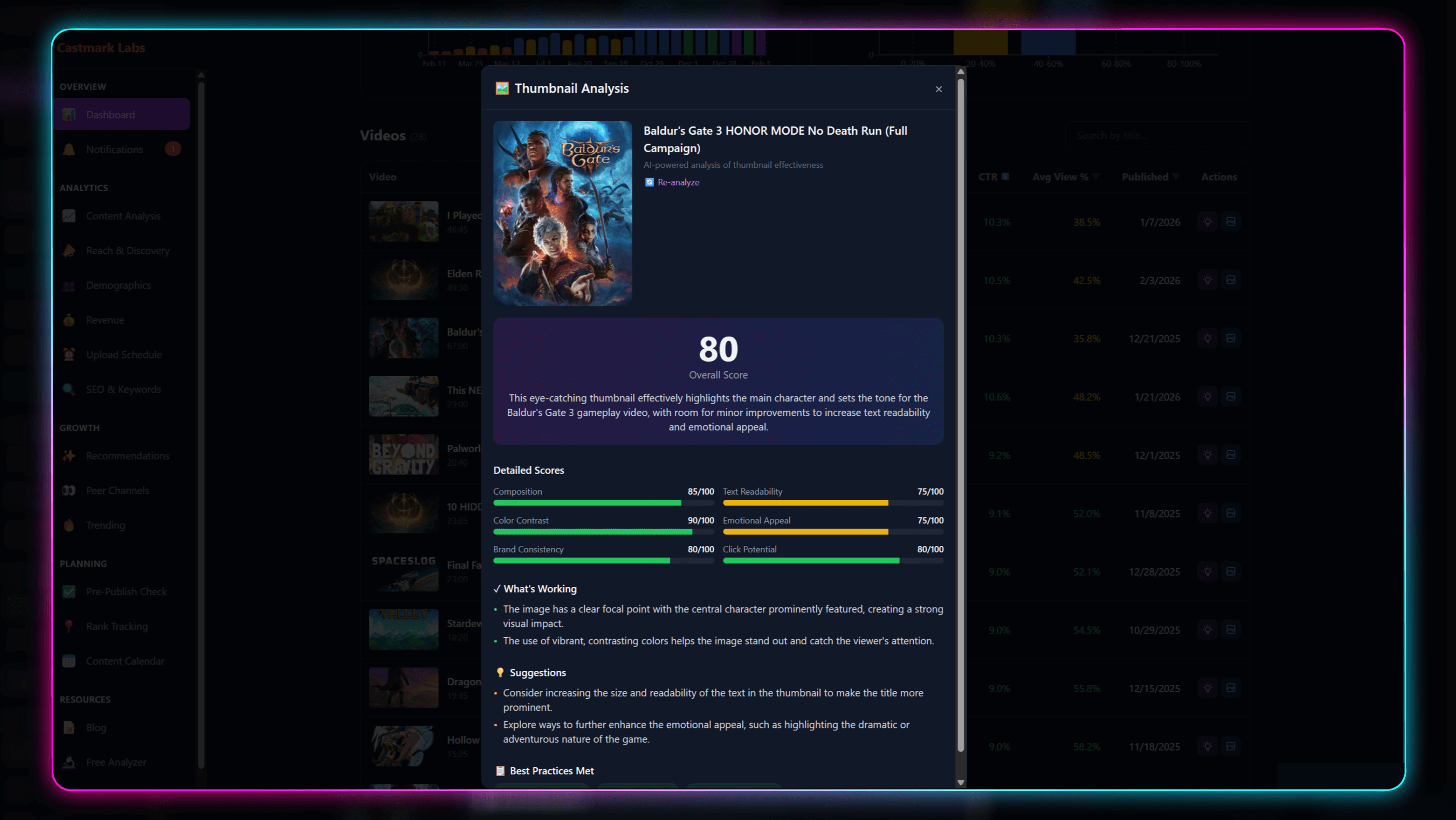 AI-powered feedback on your thumbnails — composition, text readability, and click appeal.