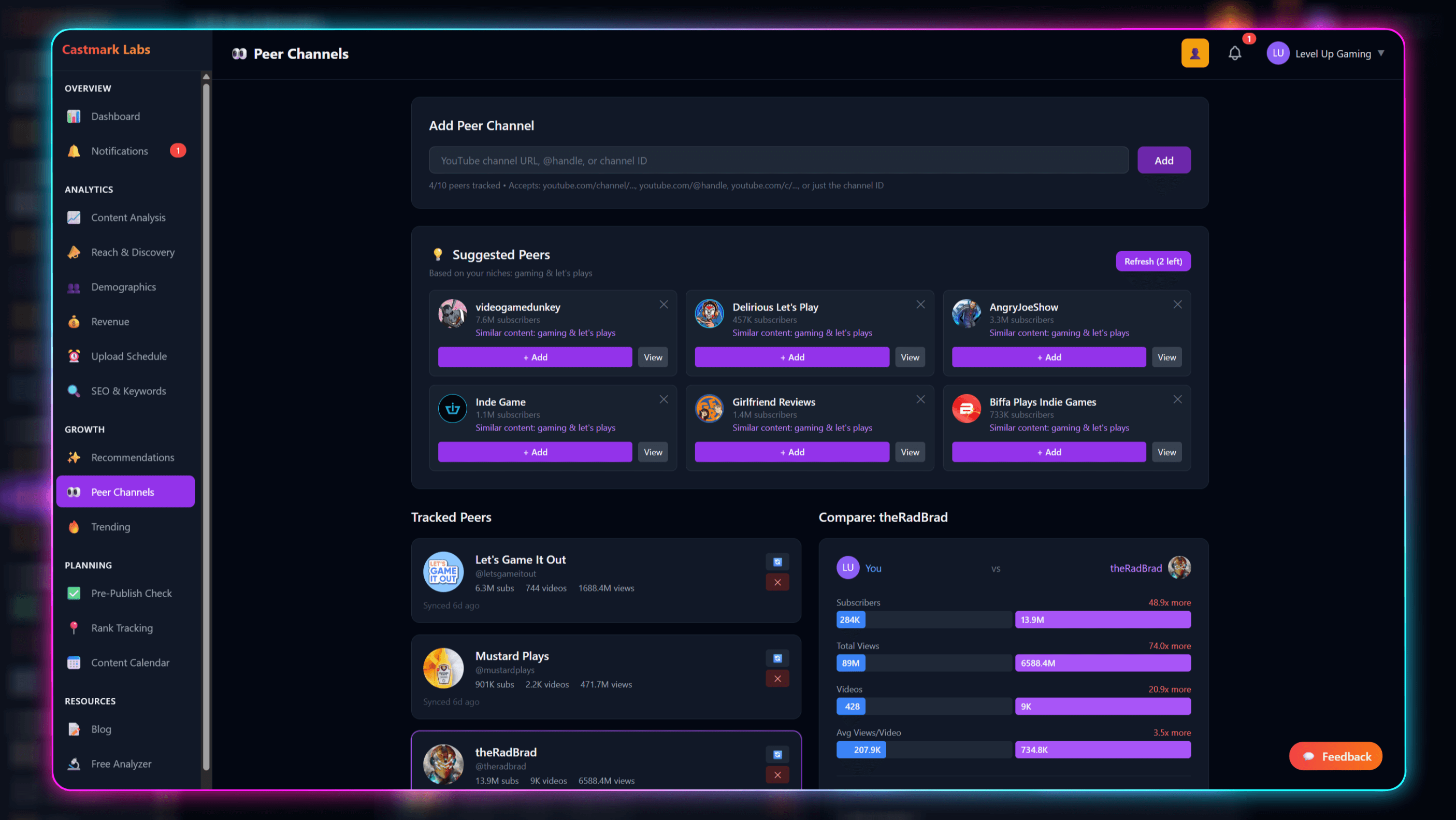 Start tracking competitors today. Free tier includes 5 peer channels.
