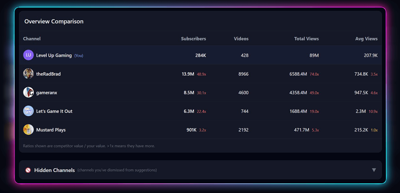 See exactly how you stack up against competitors with detailed comparison tables. Track subscriber growth, video output, and average view performance.