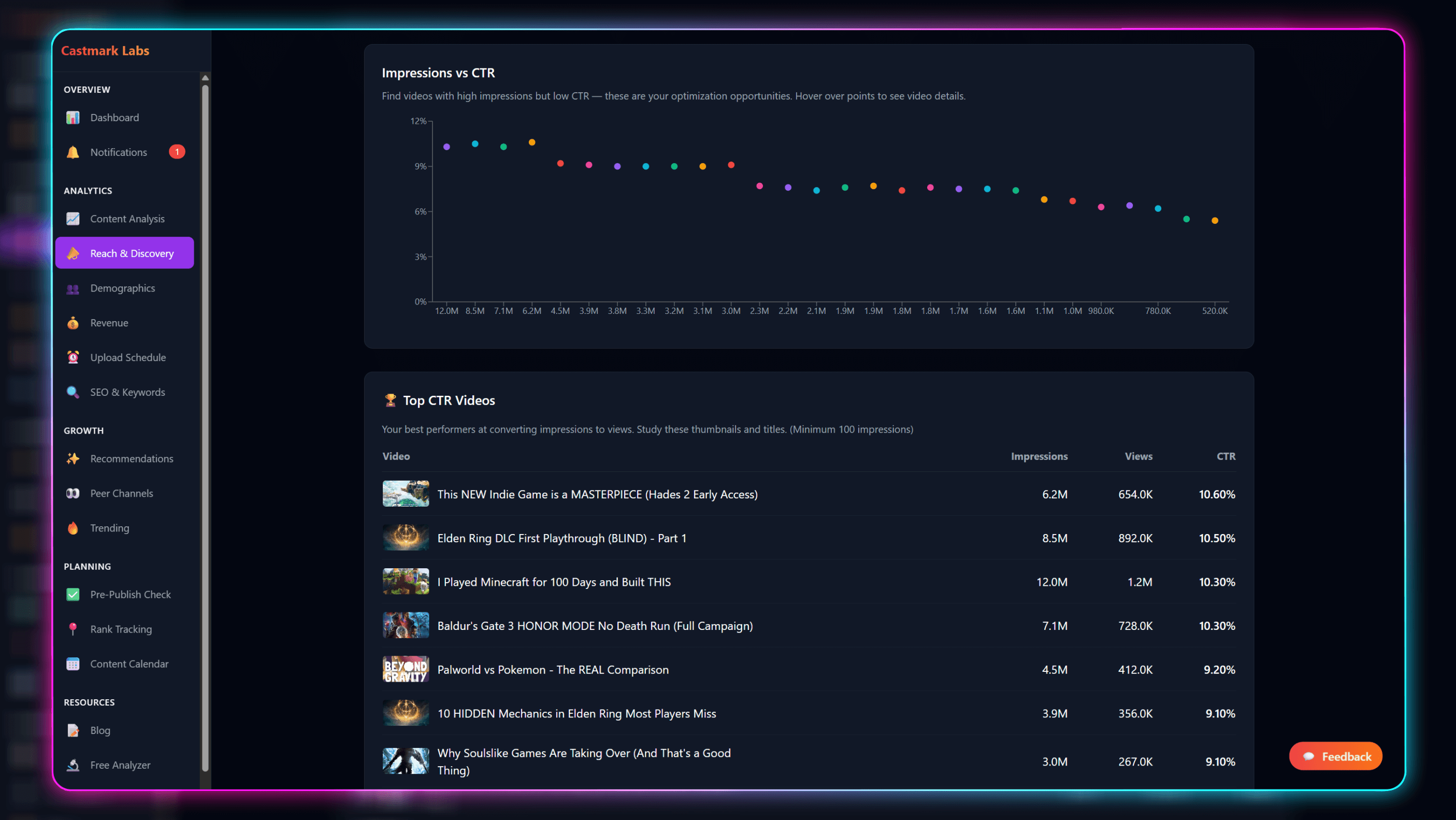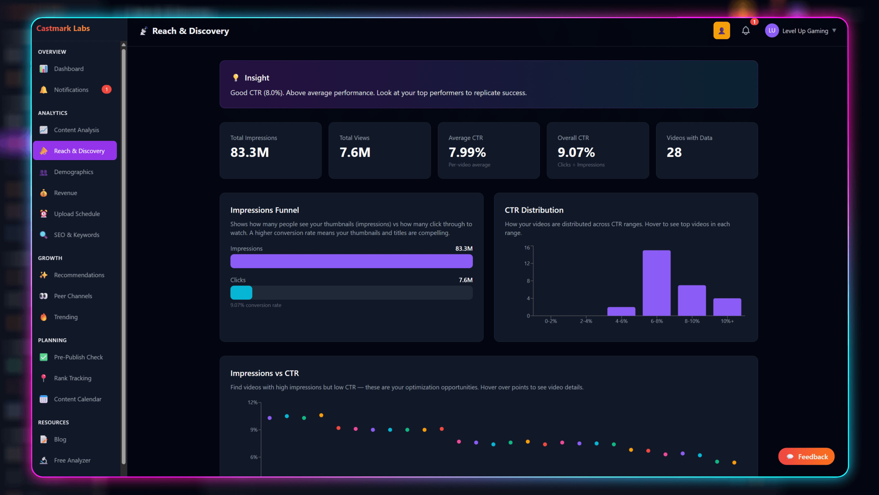 We track your CTR over time so you can see how changes to your thumbnails and titles affect performance.